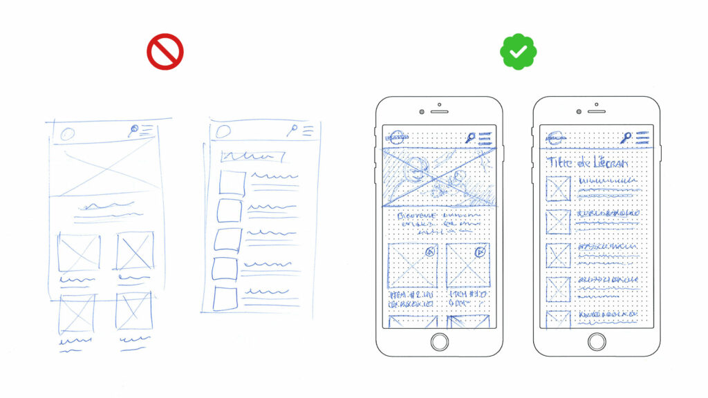 Le wireframe papier sera plus rapide à réaliser, raturer, gommer, découper et recoller. Il permet plus facilement des annotations autour des écrans.