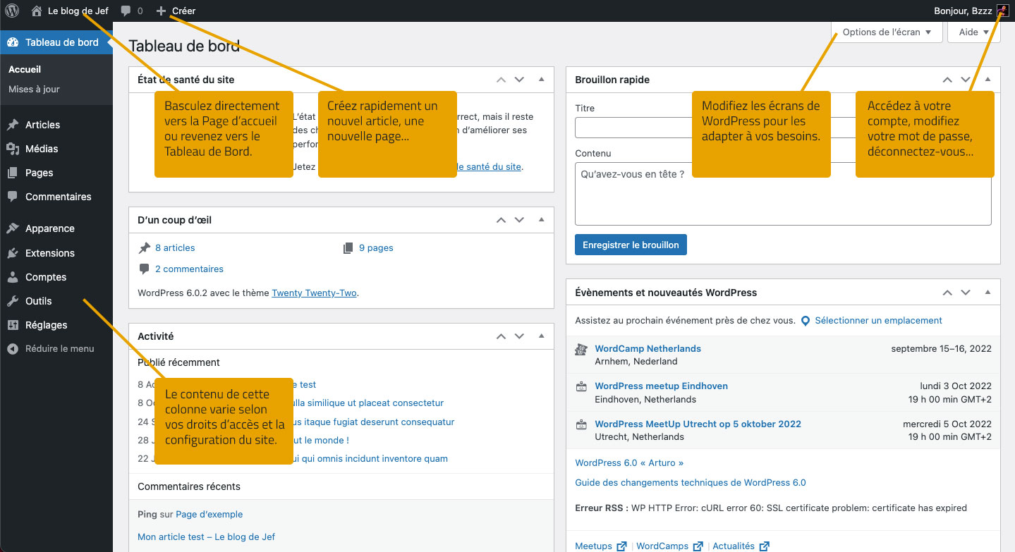 – Certains éléments d’interfaces sont disponibles ou pas, en fonction de votre profil d’utilisateur et de la configuration de votre site WordPress.
