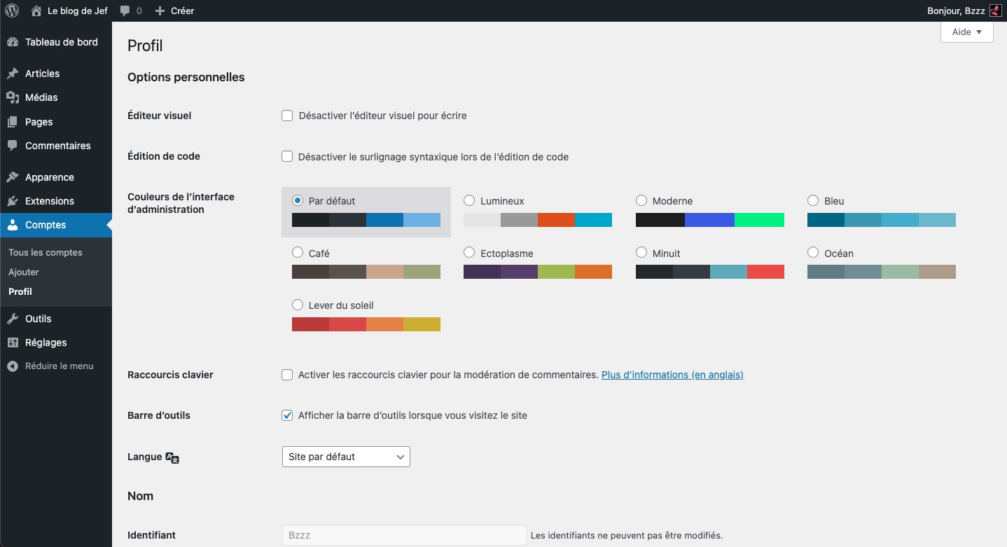 - Modifier les couleurs de l’interface d’administration. Cela ne s’applique qu’à vous si vous êtes plusieurs à gérer votre site.