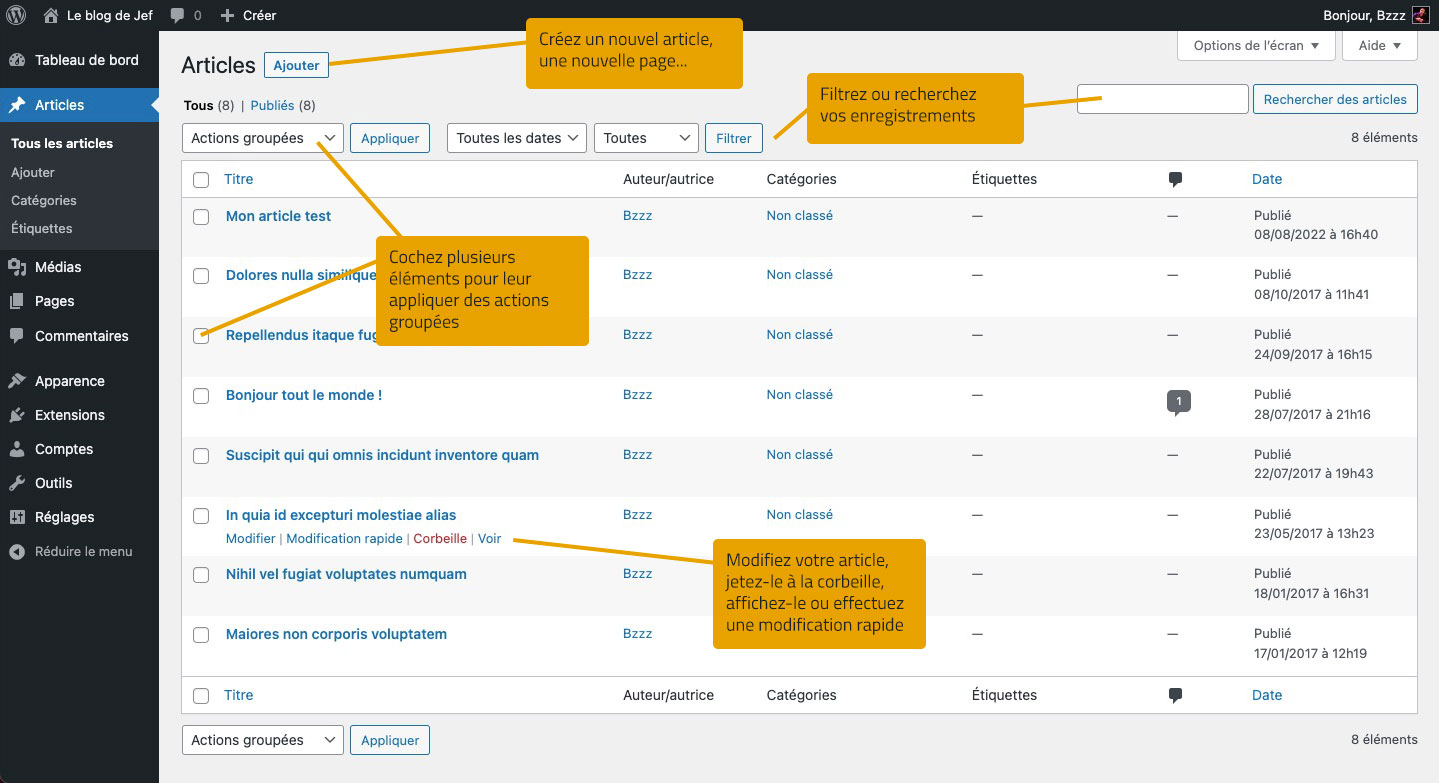 Lorsque vous cliquez sur Articles, Pages ou un autre contenu spécifique à votre site, les contenus s’affichent sous forme de tableau.